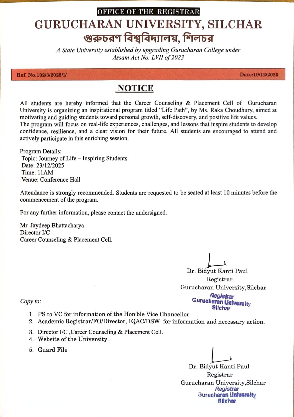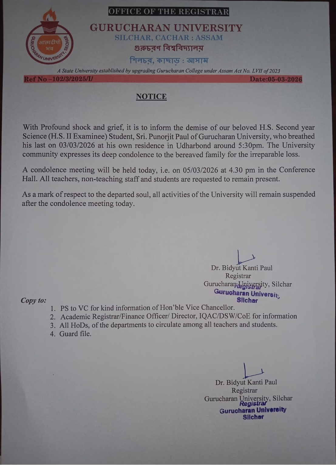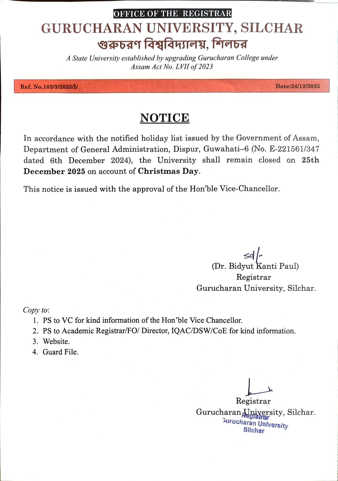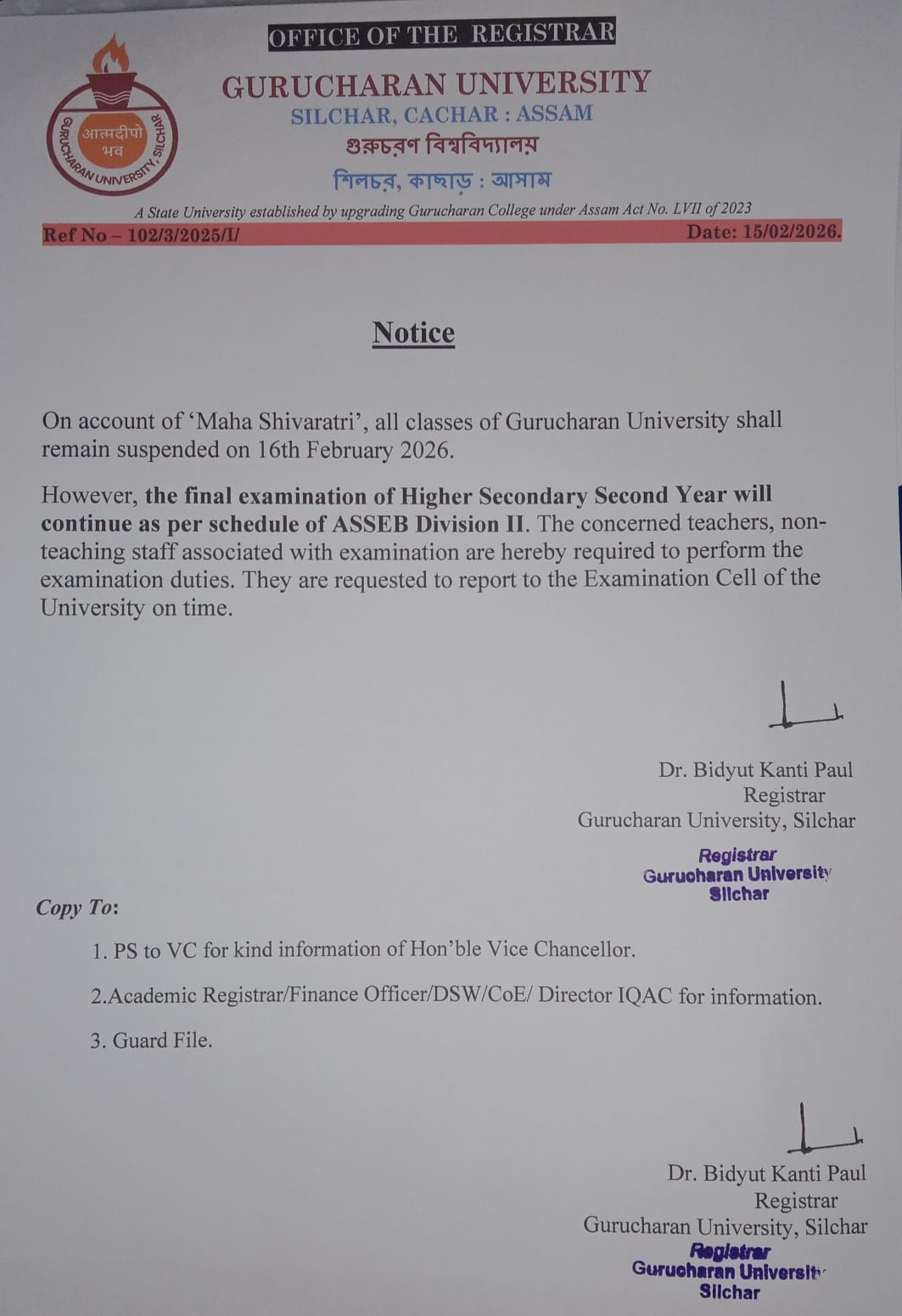 Notice: Conduct of IDC 101 & IDC 201 (Library & Information Science) Examinations Under Assam University