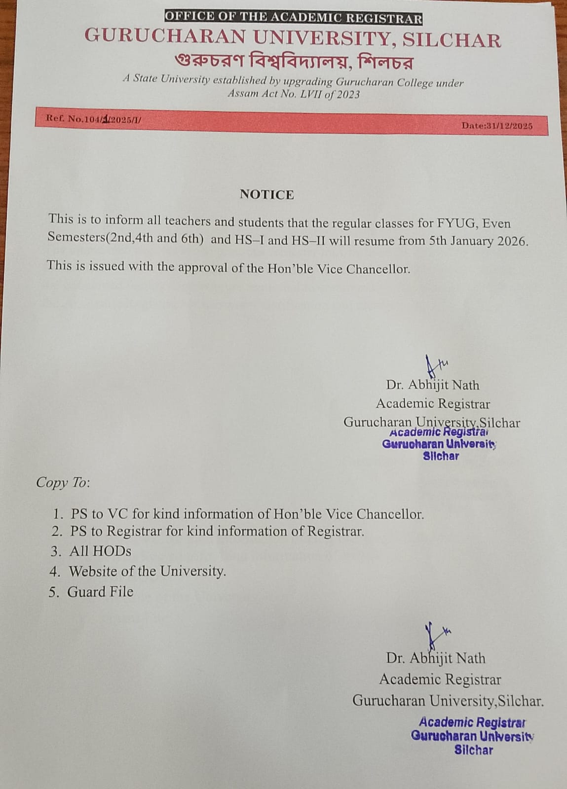 Notice Regarding Declaration of Results of FYUG 1st Semester (Regular) Examination, 2025