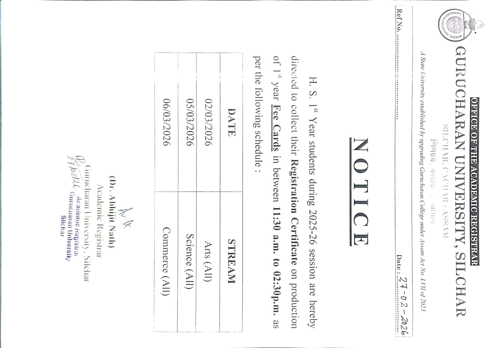 Notice Regarding Correction of HS 1st Year Registration Certificate (Session 2025–26)